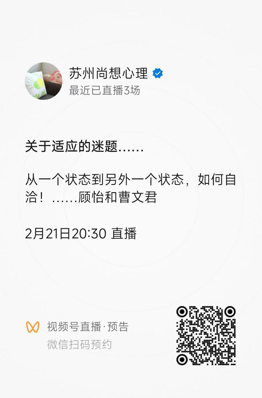【概要描述】今日探讨心理主题:关于适应的迷题…… 从一个状态到另外一个状态,如何自…..顾怡和曹文君洽!. 2月21日20:30 直播